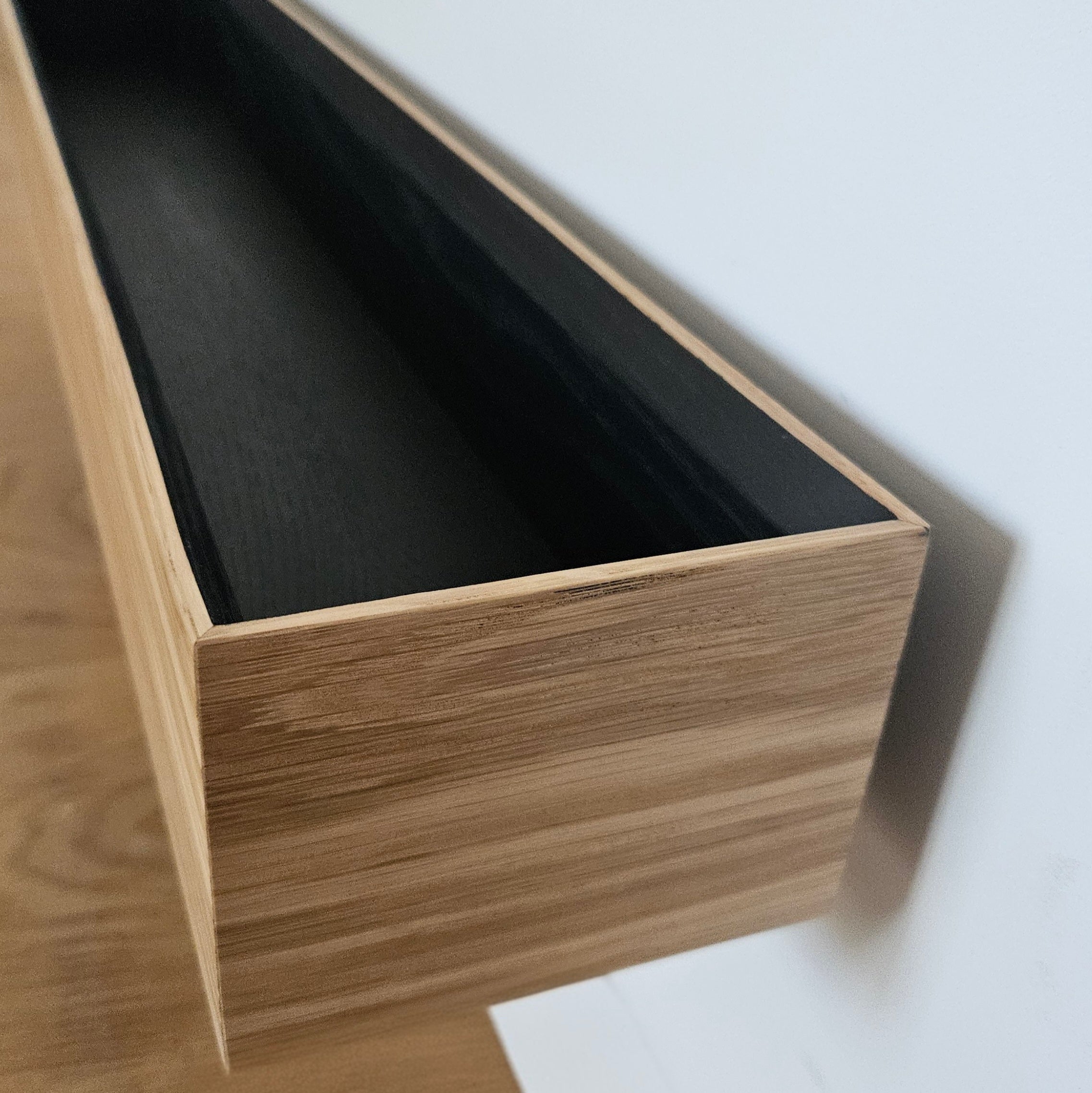 The corner connections of the wall console are mitered, as are the corners of the trays. The walls of the wall console and the trays are beveled sixty degrees at the top, creating a delicate edge of just 4 mm. The walls of the console are 12 mm thick and those of the trays are 10 mm thick.